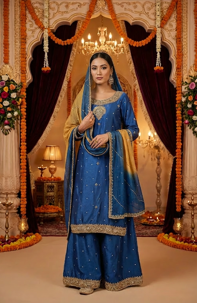 Elegant party-wear ensemble crafted in pure silk, featuring delicate gold and silver hand embroidery for a refined, festive look. The outfit is paired with a lightweight chiffon dupatta finished with subtle Mukesh embroidery, adding a soft touch of shimmer. Perfect for special occasions and evening gatherings.